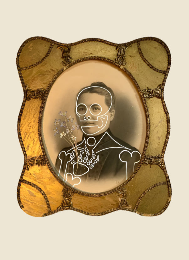 Intertwangled old Charcoal Portrait with Dried Violets from Butch's Garden. Framed with Glass