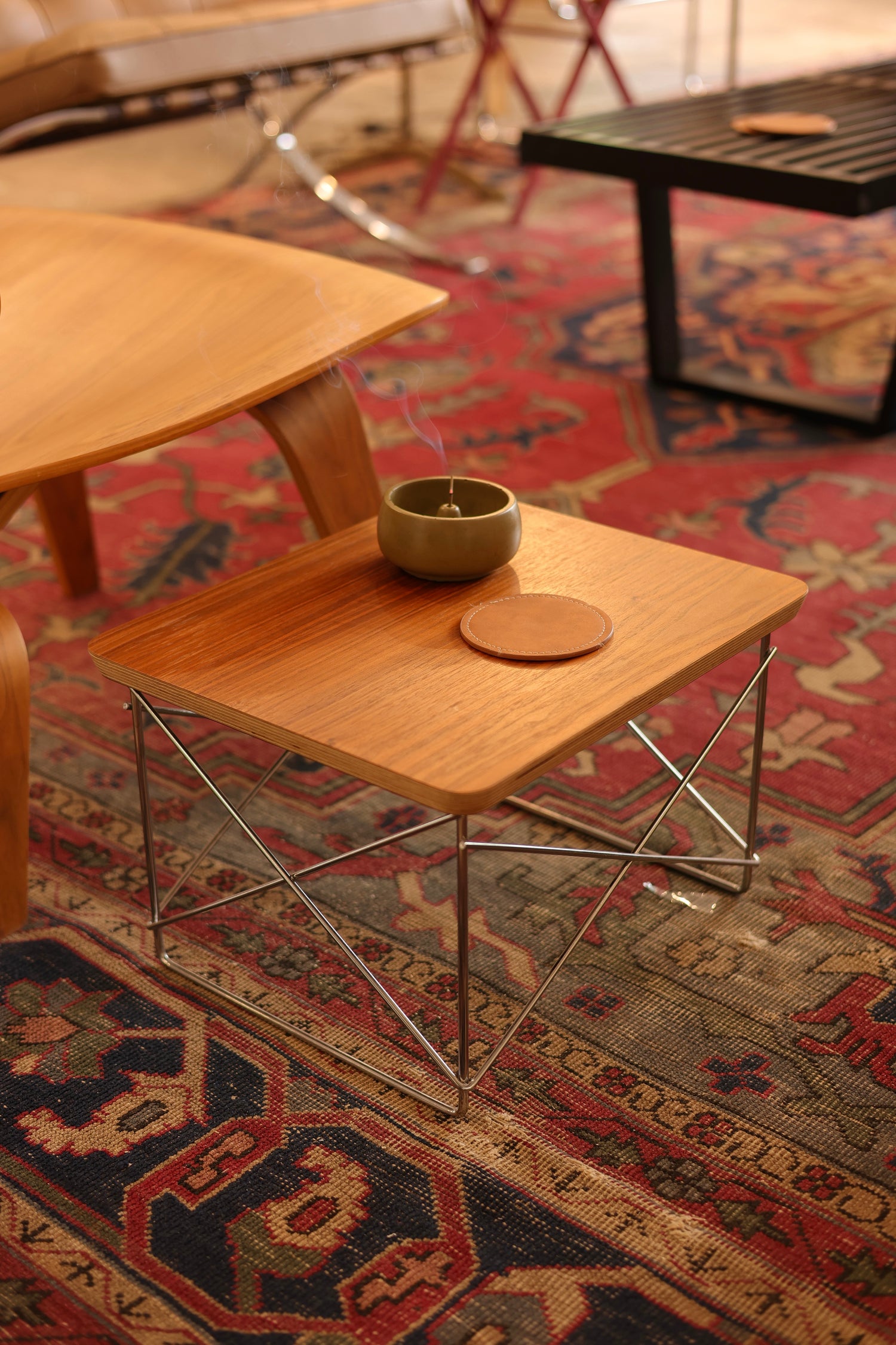 Just 10 inches high, the Eames Wire Base Low Table (1950) provides a handy surface for books or a bedside lamp. The beveled edges of the top of this Eames side table reveal seven layers of sturdy birch plywood. Portable and lightweight, these low wire base tables can be stacked for storage or grouped to form a larger surface. This is the authentic Wire Base Low Table produced by Herman Miller.