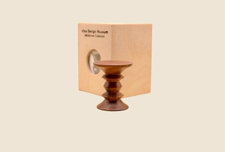 A miniature replica of the classic Eames design. An iconic stool design crafted of turned wood.